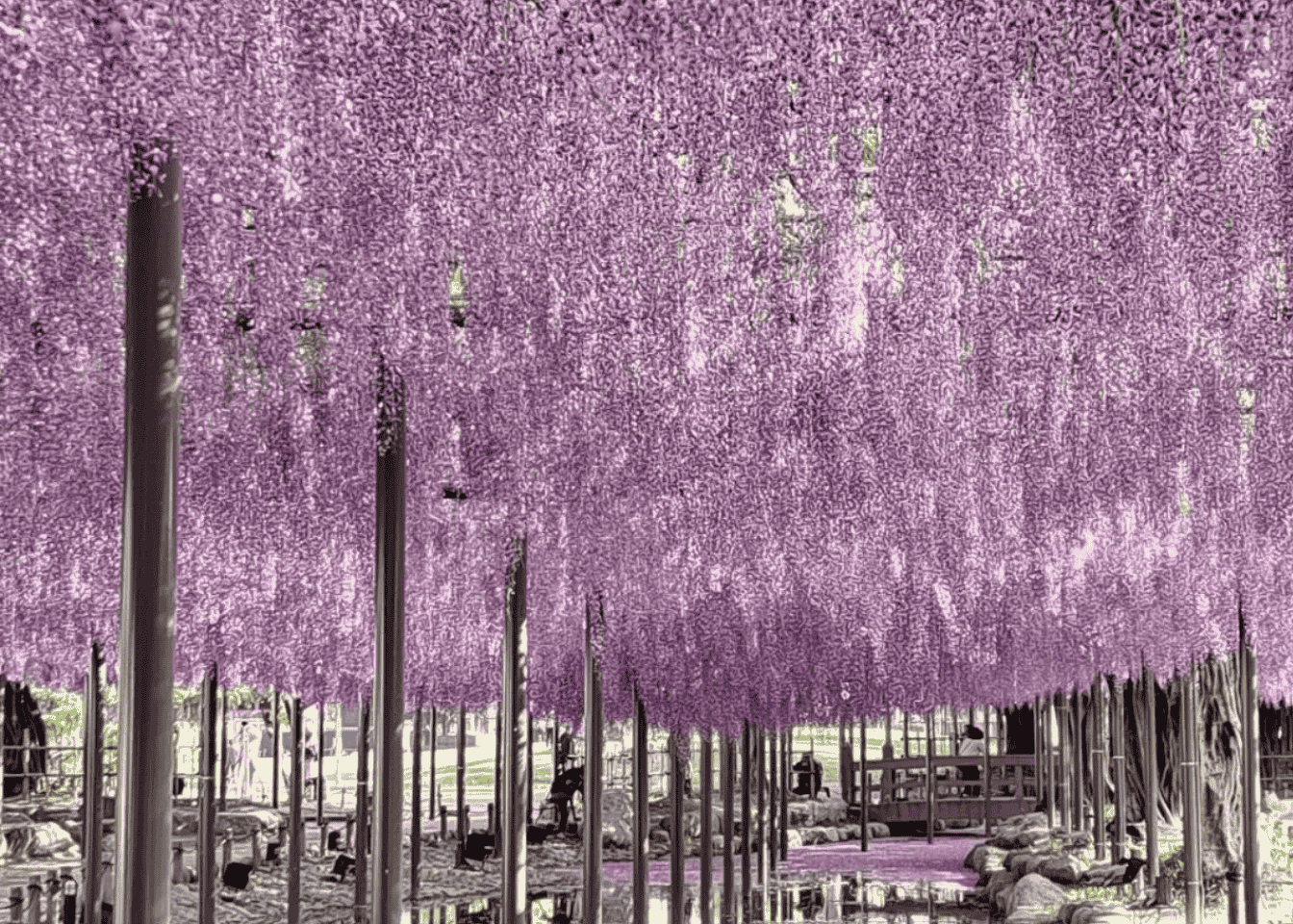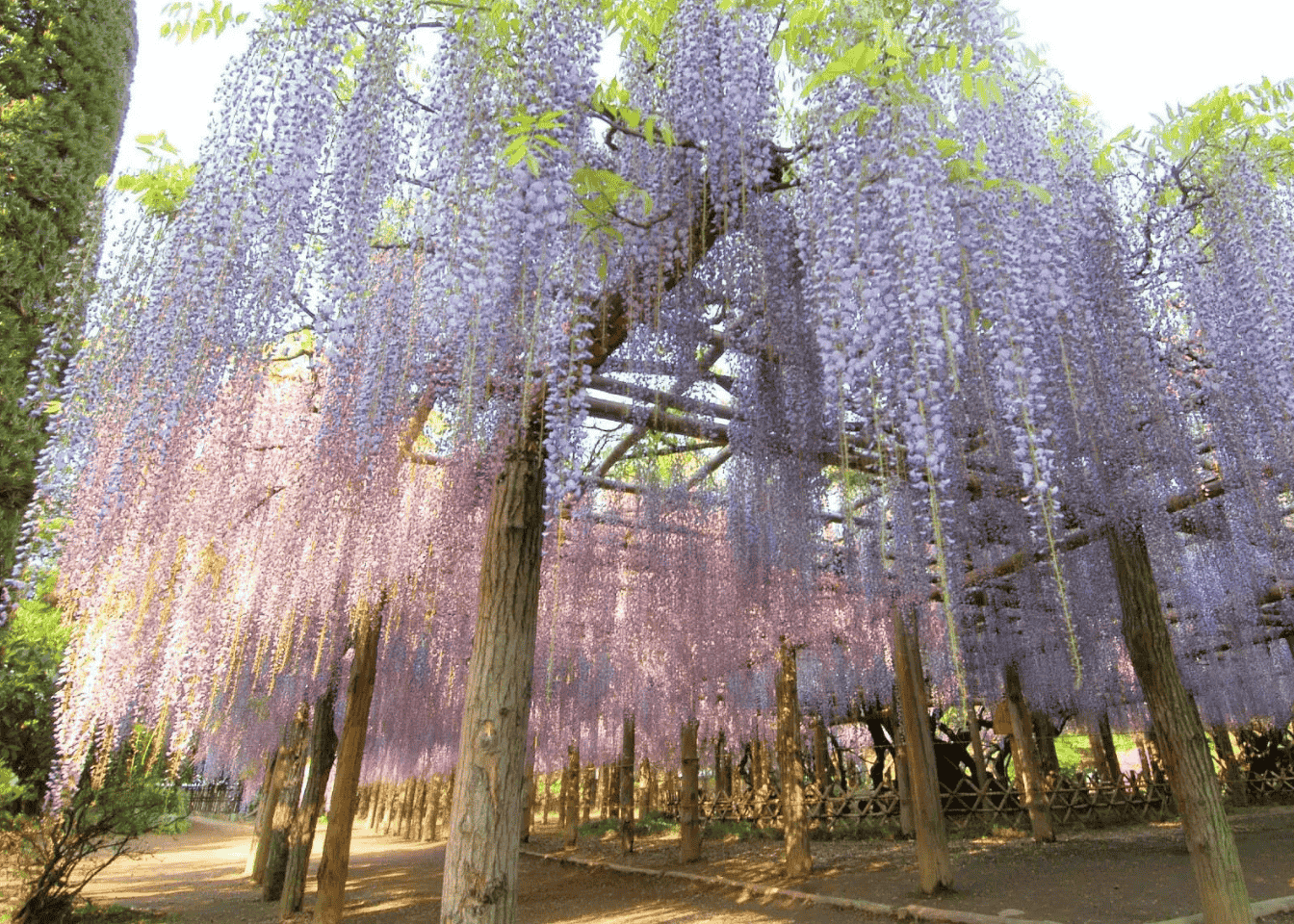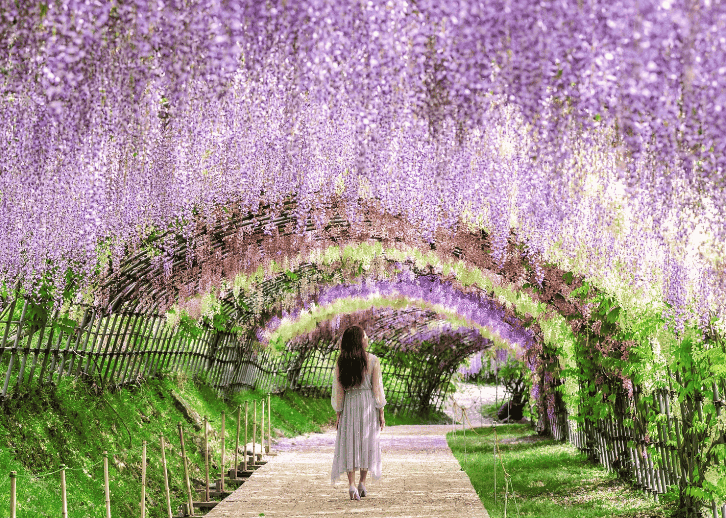 Aquí podrás caminar bajo cascadas de flores en tonos púrpura, blanco y azul, creando una experiencia inmersiva difícil de olvidar. Durante el pico de floración, el acceso suele requerir reserva previa o entradas con fecha específica.