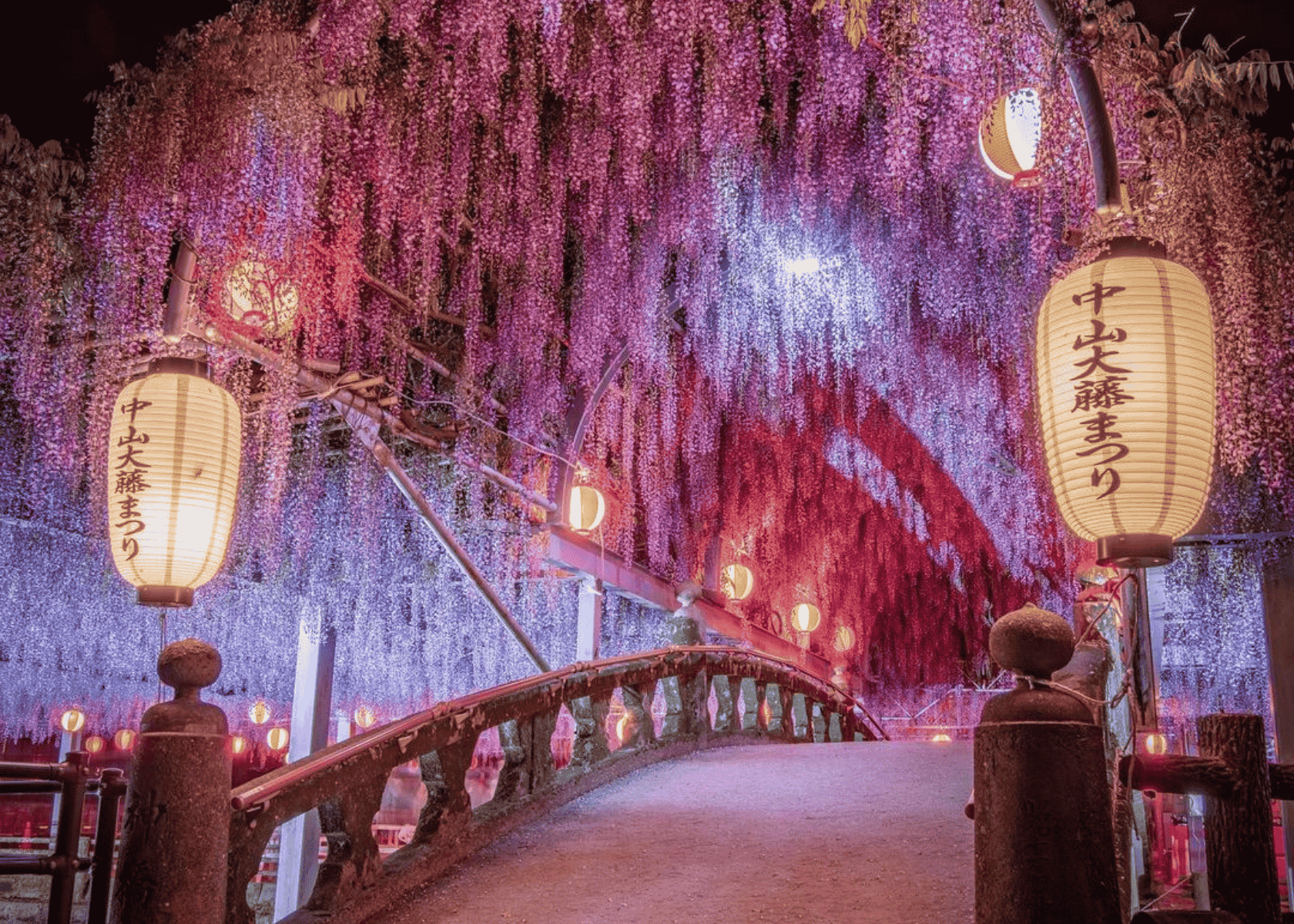 Las Nakayama no Ofuji, en Yanagawa, son un conjunto de glicinas centenarias consideradas monumento natural. Sus enormes pérgolas crean un techo floral impresionante, especialmente durante la noche, cuando se iluminan. El evento de iluminación especial nocturna solo se produce cuando están las glicinas en flor.